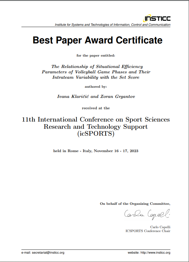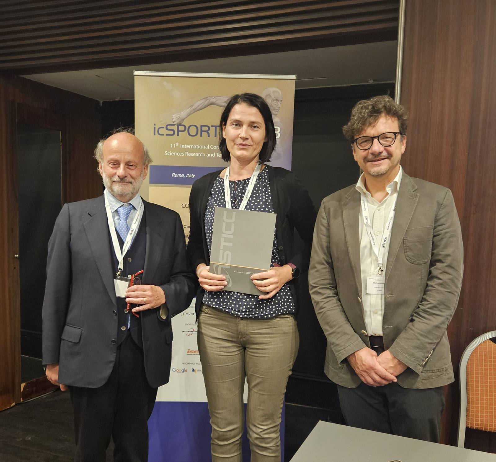 Izuzetno smo ponosni objaviti da je naša docentica, doc. dr. sc. Ivana Klaričić, nedavno nagrađena na konferenciji “The 11th International Conference on Sport Sciences Research and Technology Support,” održanoj u Rimu od 16. do 17. studenog 2023. godine.  Cilj je konferencije  bio stvoriti prostor namijenjen susretu pripadnika akademske zajednice, sportskih stručnjaka i praktičara radi razmjene ideja i razvoja sinergija. Naglasak ove konferencije je  na područjima gdje se inženjering općenito i informacijska tehnologija posebno primjenjuju u podršci sportskim znanostima, a konferencija bi trebala pridonijeti napretku u korištenju tehnologije u sportskim znanostima i poticati suradnju između različitih sektora povezanih sa sportom.