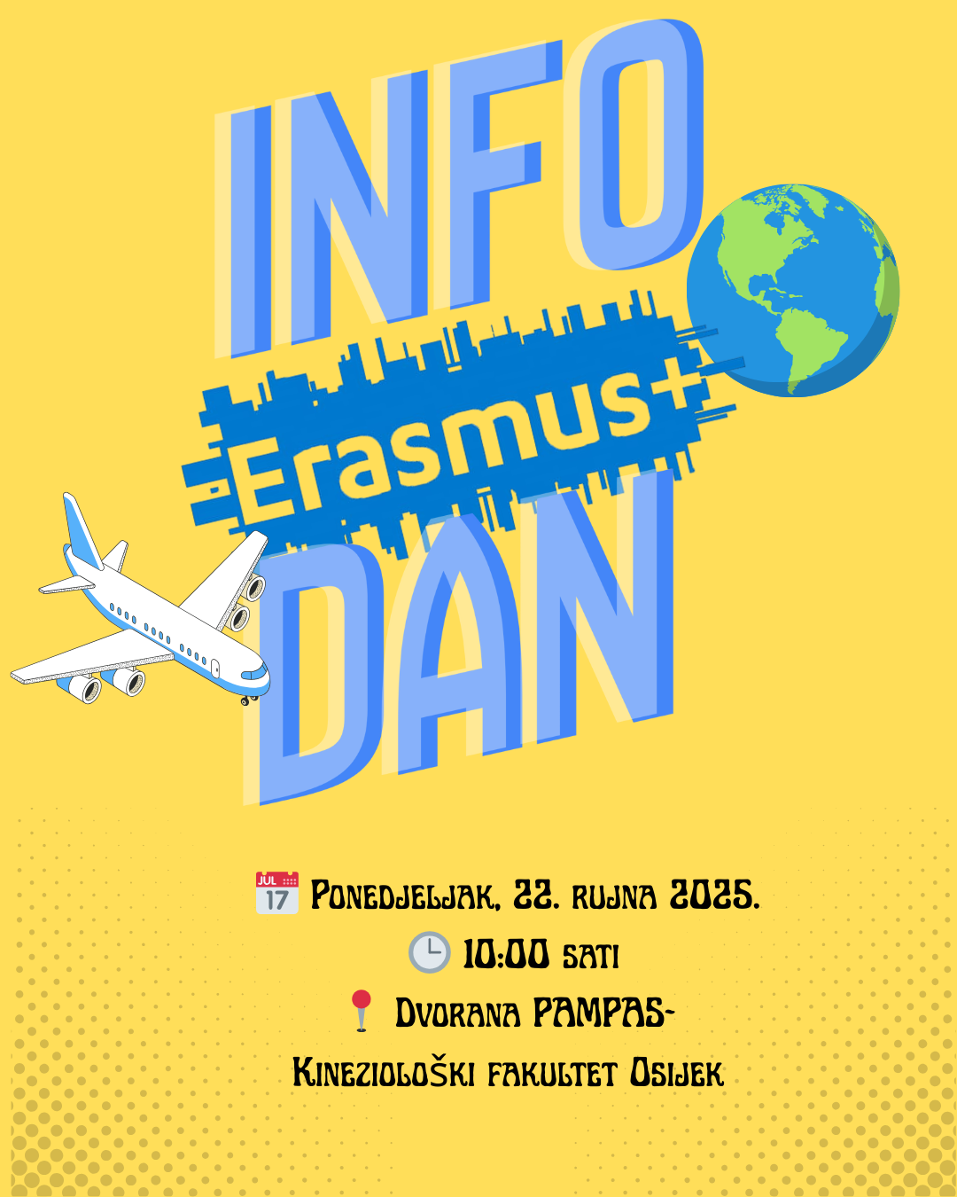 U ponedjeljak, 22. rujna 2025. godine u 10:00 sati, na Kineziološkom fakultetu Osijek održat će se Erasmus+ info dan namijenjen svim studentima zainteresiranima za prilike koje nudi Erasmus+ program.
