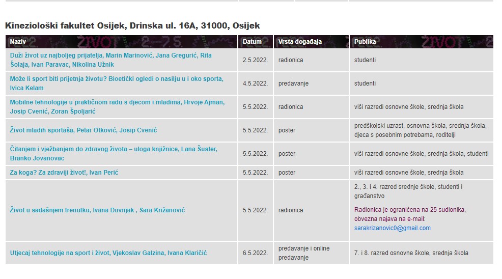 Festival znanosti je u tijeku, i trajat će do 7. svibnja 2022., stoga nemojte propustiti ovogodišnji bogat program koji se trenutno održava na gotovo svim sastavnicama osječkoga sveučilišta. Glavna tema ovogodišnjeg festivala je ŽIVOT. Tema koja je dovoljno široka kako bi, kao i uvijek, omogućila kreiranje raznolikog, zanimljivog i zabavnog programa namijenjenog široj publici. Kineziološki fakultet Osijek se i ove godine pridružuje i sudjeluje s mnogim radionicama, predavanjima i posterima