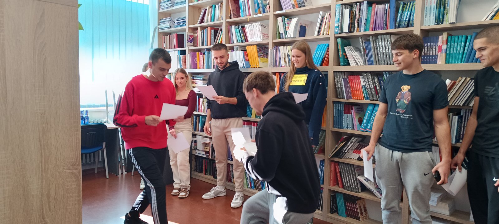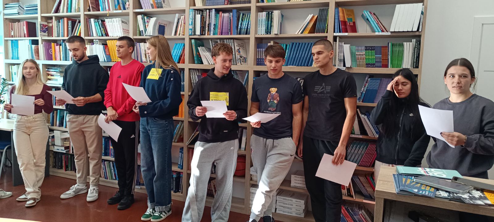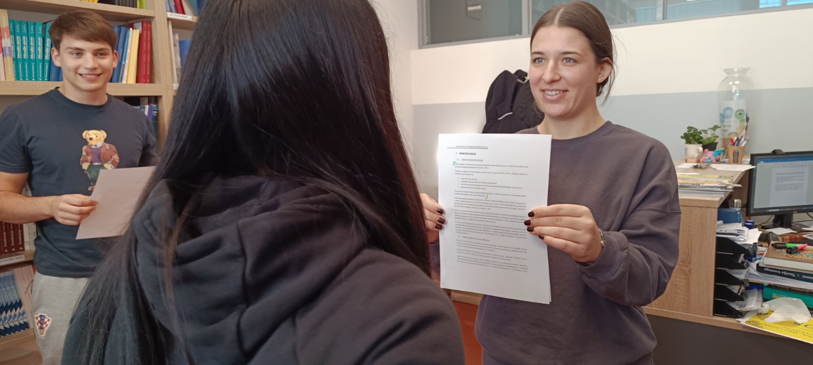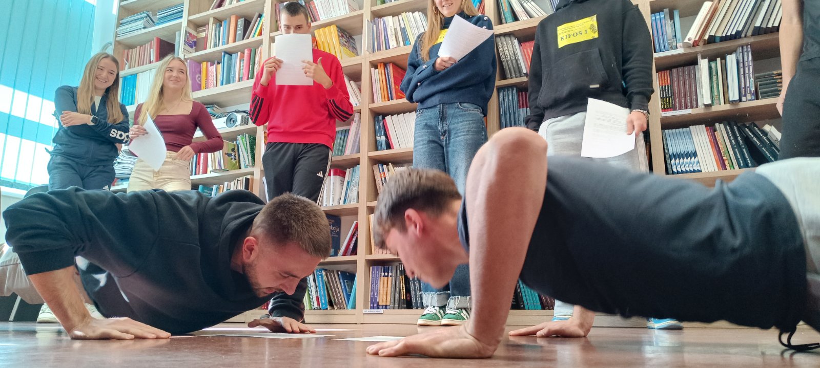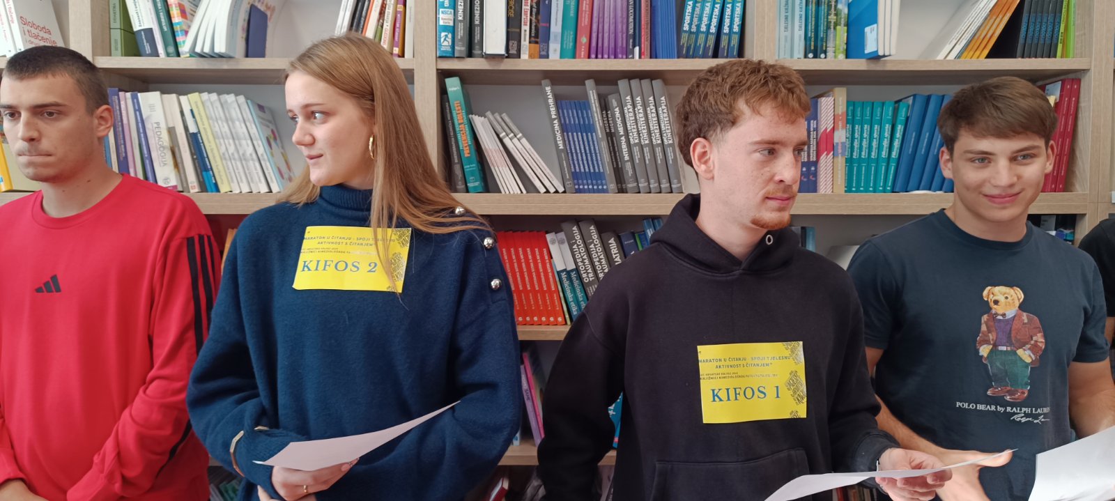Sposobnost sportaša je upravo snalaženje u novim okolnostima, a spajanje ove dvije aktivnosti dodatno je motiviralo studente i okolinu. Navikli smo čitati u sjedećem položaju, u dnevnom boravku ili na podu, ali naši su budući kineziolozi pokazali su svoju udobnost i svoje mogućnosti i čitali na glas dok su radili paralelni čučanj, plank na dlanovima, triceps ekstenziju i iskorak naprijed. Sudionici ekipa bili su:  Petra Keleković, Terezija Milković, Petra Lukić, Ena Jelčić-Meter, Miro Lordan, Franko Kalina, Niko Letica, Jakov Mihajlović i Erik Vovk. Po završetku izvođenja zadataka obje su ekipe izuzetne, no ipak jedan bila bolja. Obje su ekipe dobile utješne, ukusne i korisne nagrade. U Mjesecu hrvatske knjige naši su studenti opet dokazali da se može čitati i ove godine na “kifosovski” način i da je “baš fora” biti dio Mjeseca hrvatske knjige. Svake godine studenti rado sudjeluju u knjižničnim događanjima. Od prvog knjižničnog događanja 2021. godine, u Mjesecu hrvatske knjige pa do danas, knjižnica je prikupila mnoštvo novih korisnika koji svakodnevno posjećuju knjižnicu i posuđuju literaturu koja se nalazi na popisima obvezne literature različitih kolegija koji se izvode na Kineziološkom fakultetu Osijek.