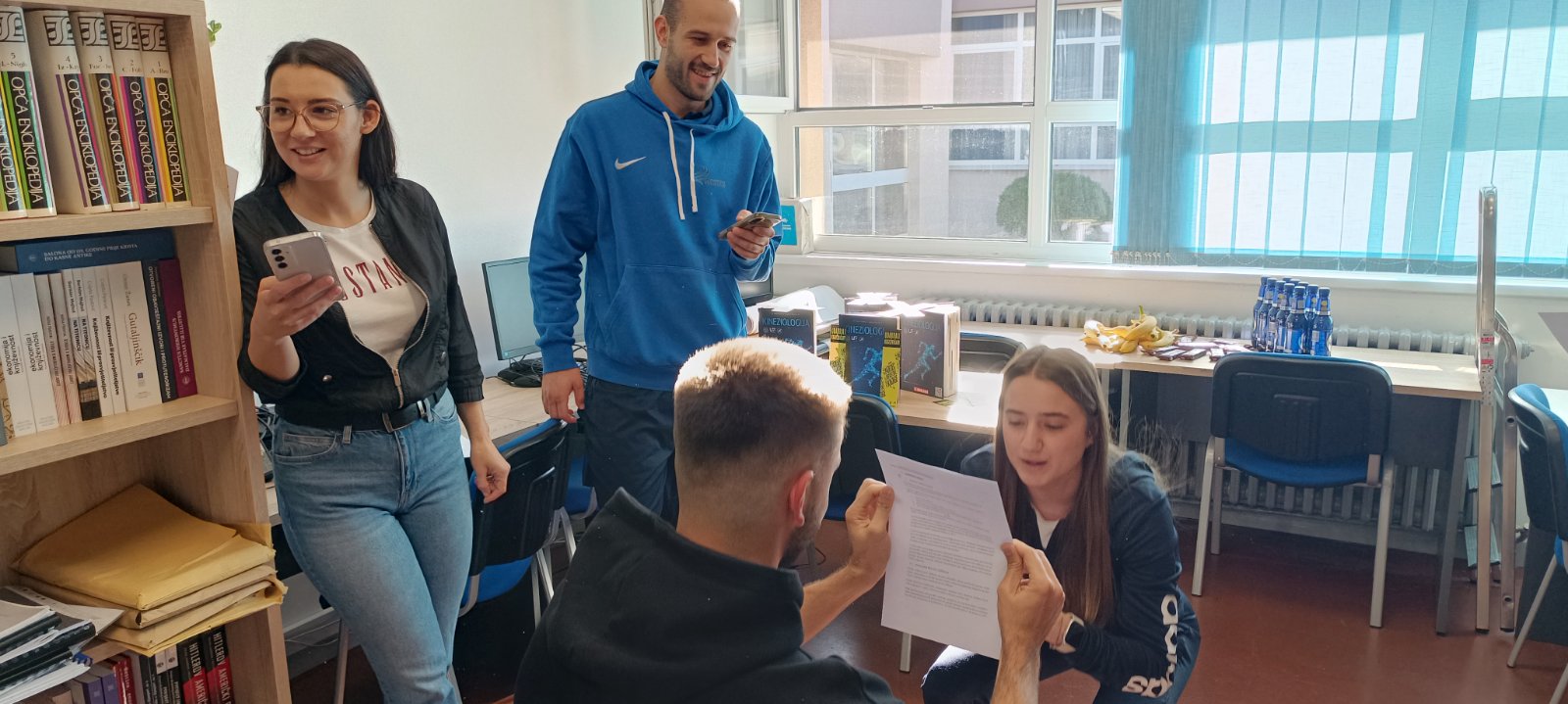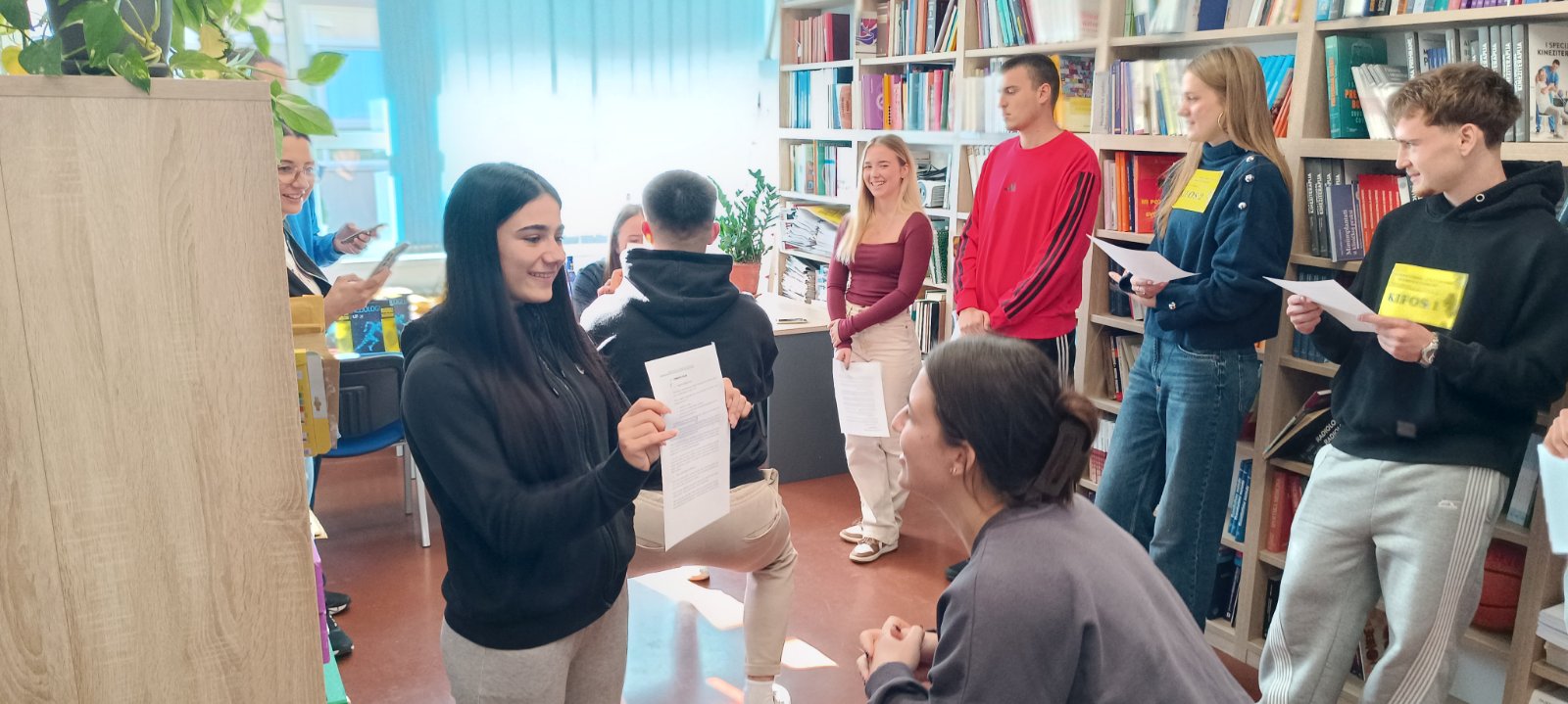 Već petu godinu zaredom Knjižnica KIFOS-a tradicionalno organizira aktivnost Maraton u čitanju – spoji tjelesnu aktivnost s čitanjem u kojoj imaju mogućnost sudjelovati studenti Kineziološkoga fakulteta. Cilj ove knjižnične aktivnosti spaja ne samo čitanje sa studiranjem nego i nastavnike s knjižnicom koji uvelike pomažu aktivirati i približiti studente knjižničnom prostoru i knjižničnim uslugama. Tjelesna aktivnost nije samo briga za tijelo — ona potiče mozak. Zamislite što se dogodi kada te dvije navike spojimo: čitamo obveznu literaturu i istovremeno uključimo kratke, ciljane vježbe. Dobivamo aktivno učenje koje razbija monotoni skrol, povećava koncentraciju i integrira znanje u tijelo i um. Kratke vježbe podižu protok krvi, razbuđuju pozornost i pomažu zadržavanju informacija. Čitanje obvezne literature razvija sposobnost argumentacije, prepoznavanja metodologije i prosudbe izvora. Spojimo li to — čitanje + pokret — dobivamo uvježbavanje kritičkog mišljenja kroz tijelo: bolje zapažate kontradikcije, brže prepoznavanje ključnih pojmova i aktivnije sudjelovanje u raspravi. Studenti uz tjelesnu aktivnost čitaju naglas poglavlja iz obvezne literature pojedinih kolegija. Svake godine odabir prati krovnu temu Mjeseca hrvatske knjige, a kako je ove godine tema Odabrali knjižničari u dogovoru s nastavnicima i astitentima Klare Findrik, mag. cin i Davora Kune, mag. cin. i knjižničarke Lane Šuster odlučilo se za dio novog naslova u knjižnici,  Kineziologija u primarnom obrazovanju, autora Aleksandre Pejčić, Biljane Trajkovski i Zvonimira Tomca. Promocija knjige, održat će se na Kineziološkom fakultetu Osijek 6. studenoga u dvorani Pampas s početkom u 13 sati. Izlazak novog naslova u području kineziologije savršeno se uklopilo i u ostale naslove obvezne literature koje prate kolegij Sistematske kineziologije.  Stoga je izuzetna čast i zadovoljstvo imati prvi uvod u svježe otiskan tekst, a to su imale naše prijavljenje ekipe maratona,  Kifos 1 i Kifos 2 u suparničkom su dvojcu čitale iste primjere tekstova sveučilišnog udžbenika uz vremensko praćenje izvođenja vježbi i čitanja te se bilježio rezultat. Metodičkim su postupcima stvoreni uvjeti za prikaz motoričkog znanja, a samim time studenti su pokazali da vladaju gradivom koje je stavljeno pred njih.