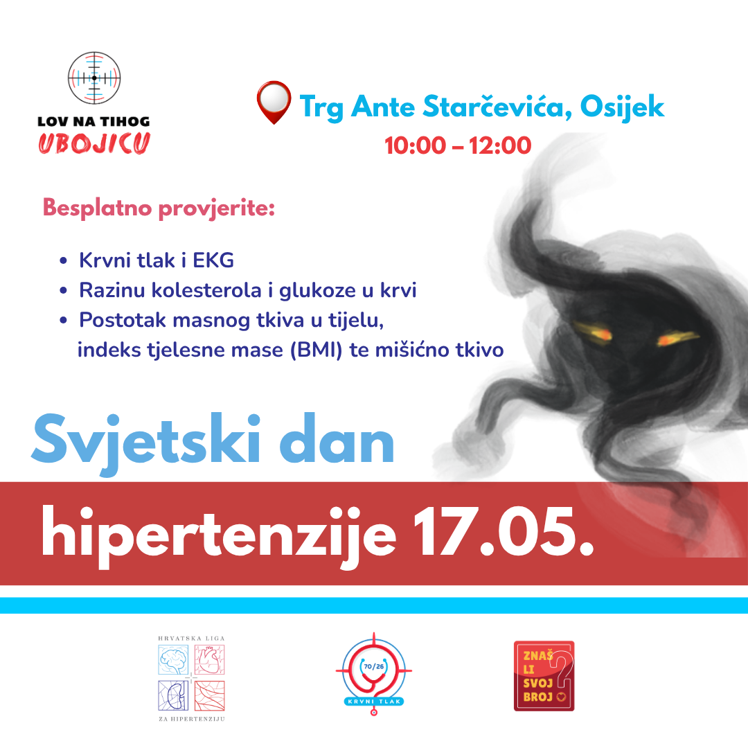 U subotu, 17. svibnja 2025., na Trgu Ante Starčevića u Osijeku, od 10 do 12 sati održat će se središnja javnozdravstvena akcija povodom obilježavanja Svjetskog dana hipertenzije. Akciju organiziraju Hrvatska liga za hipertenziju, Kineziološki fakultet Osijek i Medicinski fakultet Osijek.