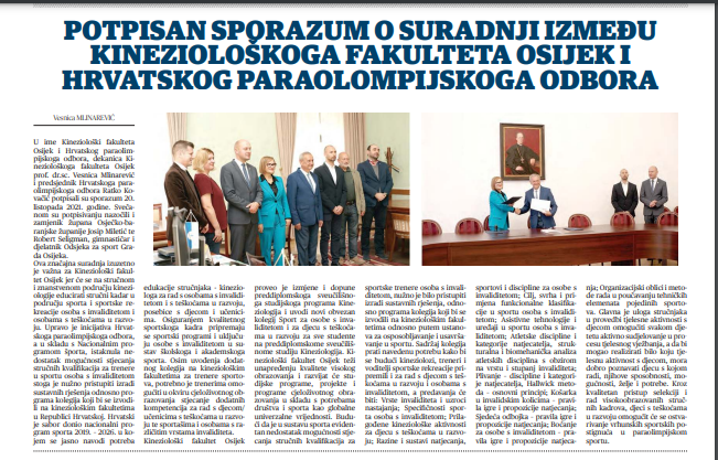 03.12.2021 POTPISAN SPORAZUM O SURADNJI IZMEĐU KINEZIOLOŠKOG FAKULTETA OSIJEK I HRVATSKOG PARAOLIMPIJSKOG ODBORA