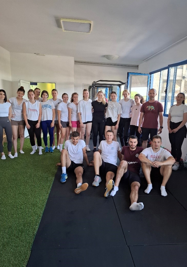 U suradnji sa Studiom “Eccentric”, na Kineziološkom fakultetu Osijek održana je praktična radionica 5. lipnja 2025. godine u sklopu kolegija Kineziološka analiza u fitnesu na temu Funkcionalni trening. Treneri Igor Dačić i Matko Sabljo studentima druge godine sveučilišnog prijediplomskog studija održali su trening tijekom kojeg su im prikazali osnovne vježbe funkcionalnog treninga te objasnili način njegove provedbe. Cilj radionice bio je povezati teorijska znanja s praktičnim iskustvom u radu s rekreativcima. Studenti su iskazali veliki interes i aktivno sudjelovali u svim segmentima radionice.