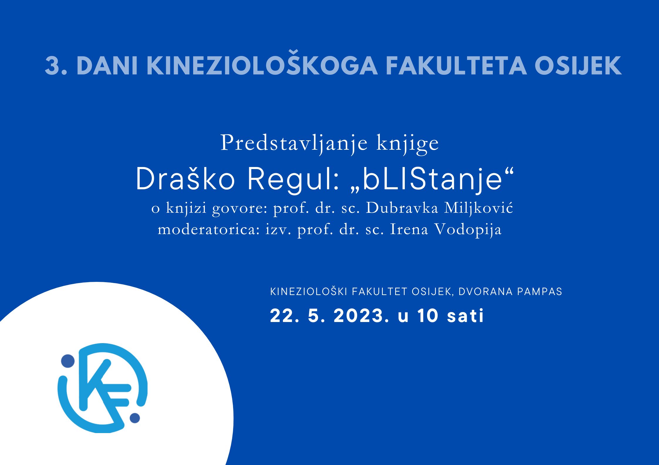 U ponedjeljak 22. svibnja 2023. godine na Kineziološkom fakultetu Osijek predstavljena je knjiga Draška Regula “bLIStanje”. O knjizi su govorile prof. dr. sc. Dubravka Miljković i izv. prof. dr. sc. Irena Vodopija. Uz riječi Draška Regula koje su prenijele predstavljačice knjiga bLIStanje potaknula je na kreativnost, zahvalnost, život, volju… Autor je u knjizi pokušao čitateljima prenijeti kako je živjeti zaključan u svome tijelu, na izuzetno posebnom stilu pisanja, prepunom neologizama, kako je rekla lektorica knjige izv. prof. dr. sc. Irena Vodopija, jedino nam preostaje pročitati bLIStanje, a onda možete sami procijeniti.