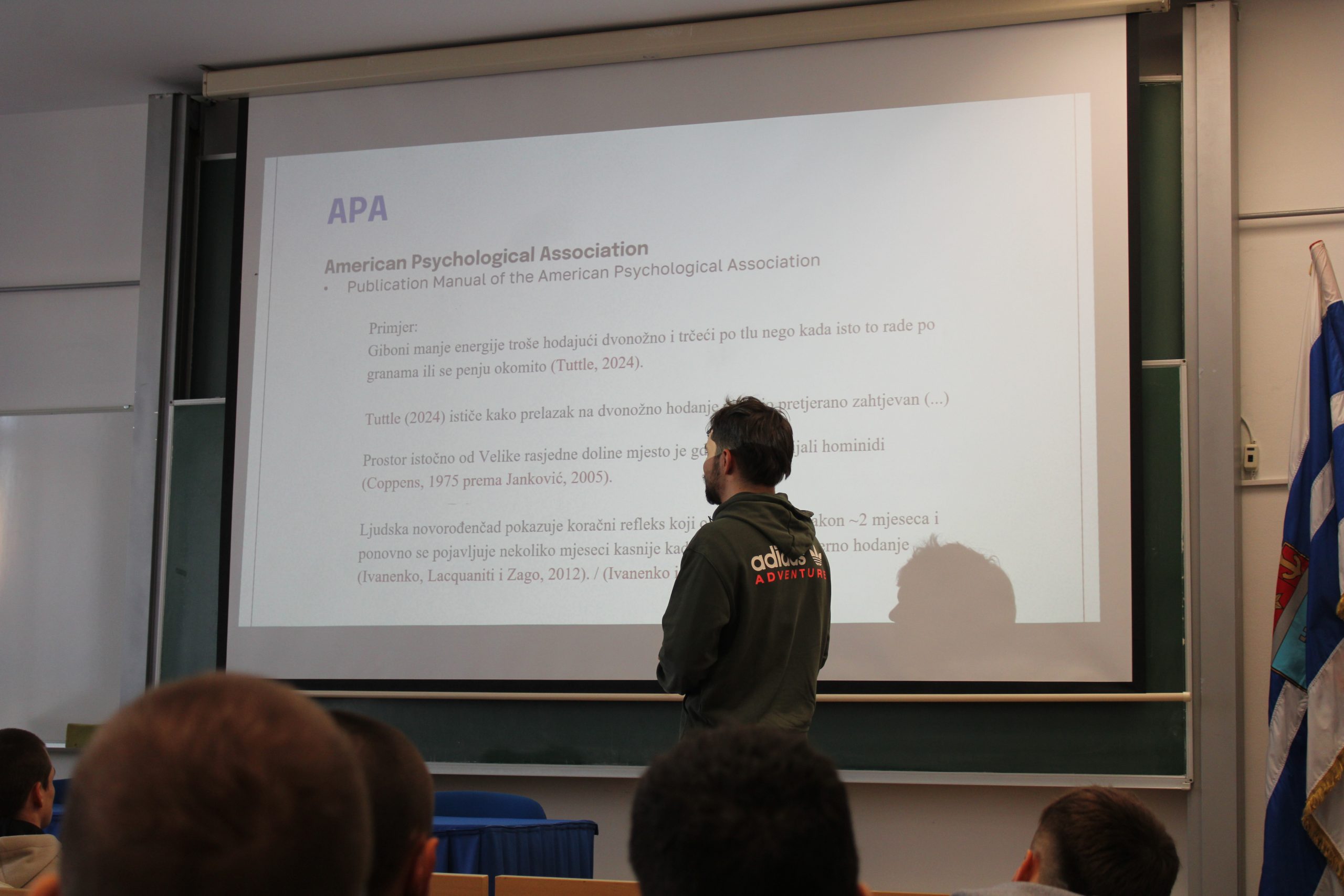 Radionica je bila osmišljena kako bi studentima pružila temeljno razumijevanje strukture znanstvenih radova, što uključuje naslov, sažetak, uvod, metodologiju, rezultate, raspravu i zaključak. Uz detaljno objašnjenje svakog dijela rada, sudionici su se upoznali s različitim stilovima navođenja izvora i literaturnim formatima poput APA, MLA i Vancouver stila, koji se često koriste u znanstvenom pisanju.