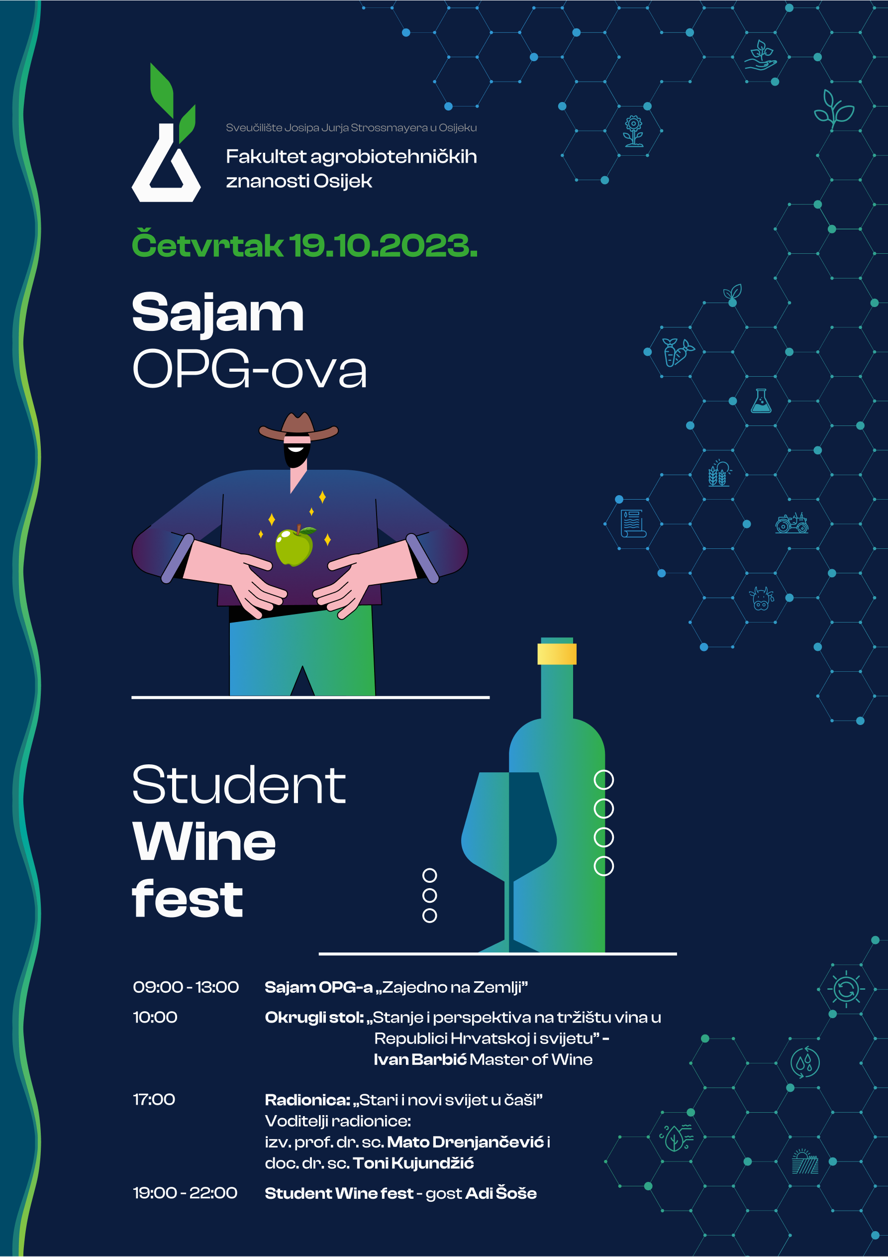 U sklopu proslave, 19. listopada 2023. godine ispred zgrade Fakulteta s početkom u 9:00h organizira Sajam OPG-ova pod nazivom „Zajedno na Zemlji“, a u nastavku dana od 19:00 do 22:00 sati Student wine fest na kojem će studenti i ostali posjetitelji uz nastup Adia Šoše moći uživati u dobrim vinima iz našeg kraja.