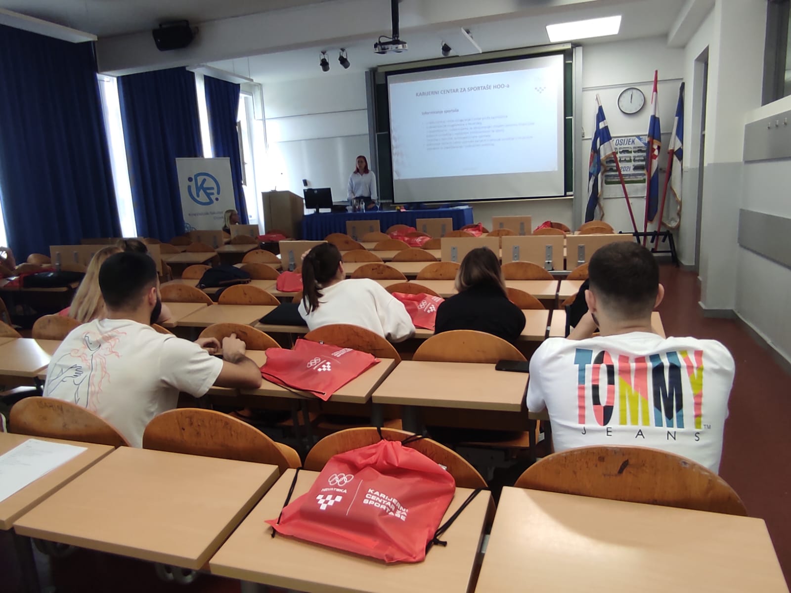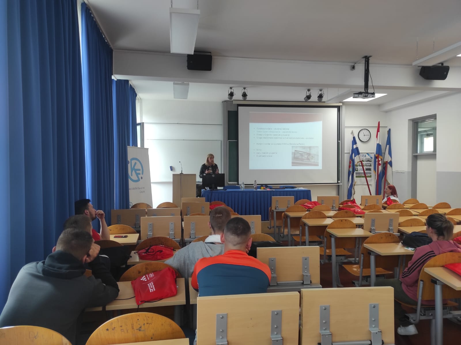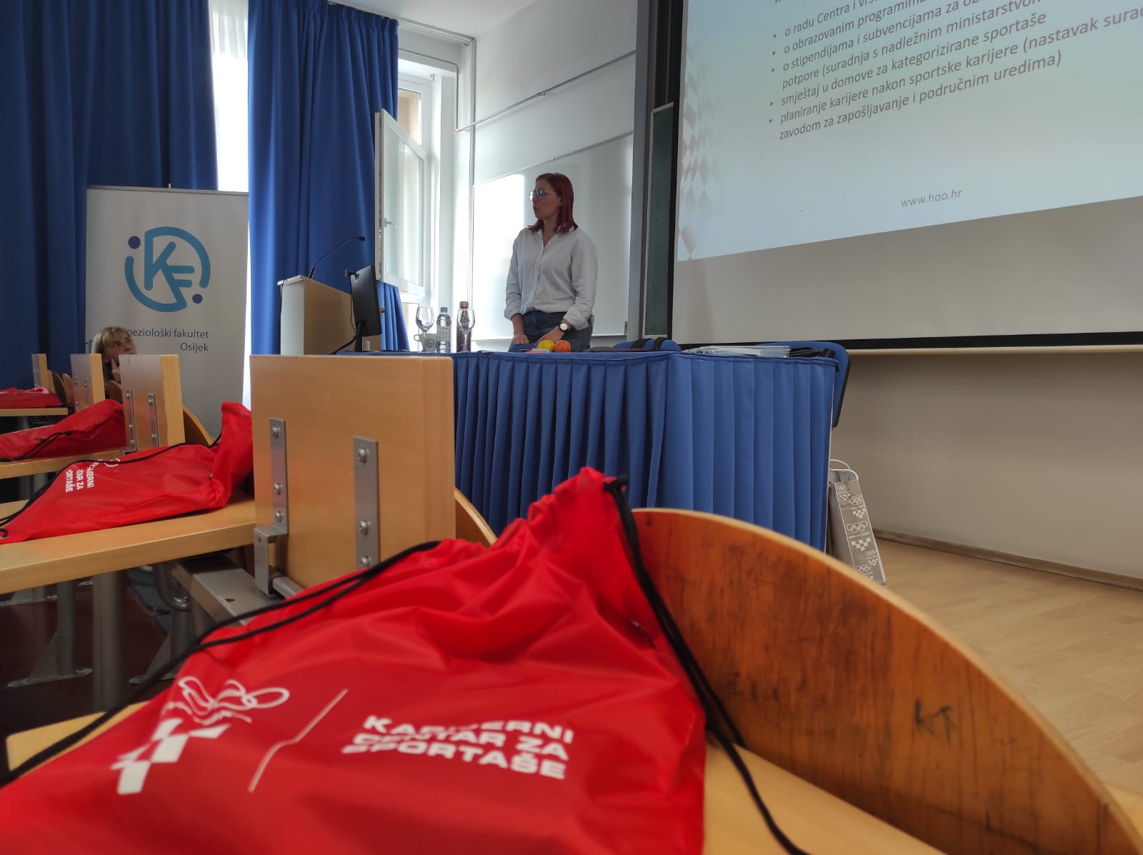 Četvrtak, 9. svibnja 2024. s početkom u 11 sati u dvorani Pampas na Kineziološkom fakultetu Osijek, u sklopu tjedna karijera održano je pozvano predavanje na temu pod nazivom: Za karijeru nakon sportske karijere – stanje i perspektive u Osječko-baranjskoj županiji kojega su održale prof. dr. sc. Romana Caput-Jogunica, predsjednica Komisije za dual karijeru u sportu HOO-a i Snježana Pejčić, voditeljica Karijernog centra za sportaše HOO-a.U uvodnom dijelu predavanja sudionici su upoznati s temeljnim pojmovima o dualnoj karijeri u sportu, problemima s kojima se susreću sportaši u sustavu obrazovanja i minimalnim standardima dualne karijere u sustavu obrazovanja. U drugom dijelu pozornost je usmjerena na kompetencije koje sportaši stječu u sportu i načinima vrednovanja stečenih kompetencija u sustavu obrazovanja, vrednovanju sudjelovanja u izvannastavnim sportskim aktivnostima i akademskom sportu. Obzirom da je Zajednica sportova Osječko-baranjske županije sudjelovala na projektima: Promocijski dani „Za karijeru nakon sportske karijere“ (2014), 2. Uspješna karijera nakon sportske karijere – Sustav podrške u zapošljavanju sportaša na regionalnoj i lokalnoj razini, a I. Gimnazija u Osijeku u projektu „Važnost mentalnog zdravlja učenika – sportaša“ (2023), predstavljeni su rezultati projekata i uloga magistara kineziologije kao budućih prof. tjelesne i zdravstvene kulture, trenera, menadžera u klubu, roditelja.