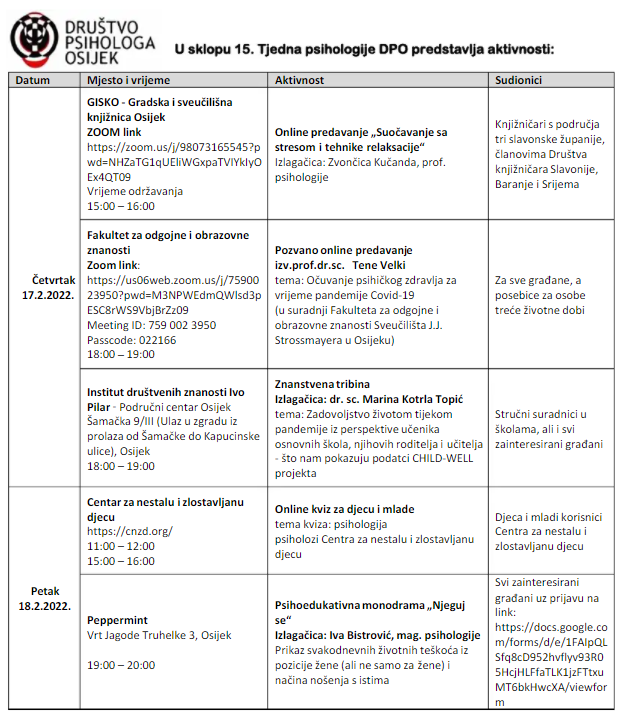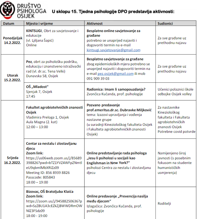 Kineziološki fakultet Osijek aktivno se uključio u Tjedan psihologije u Republici Hrvatskoj i u našem gradu te smo u suoganizaciji s Fakultetom agrobiotehničkih znanosti Osijek i Društvom psihologa Osijek pozvanog predavanja prof. emeritus. dr.sc. Dubravke Miljković